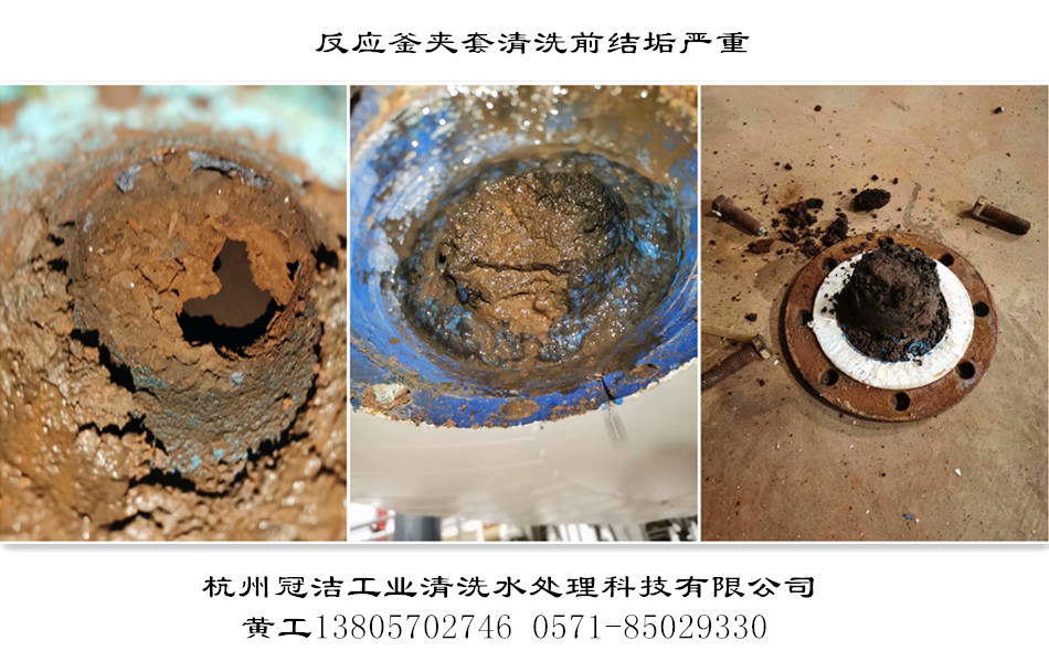 化工廠設(shè)備檢修清洗,反應(yīng)釜夾套、冷凝器、螺旋板換熱器,結(jié)垢嚴(yán)重,水垢、銹垢銹瘤、濕軟粘泥混和垢質(zhì),在使用了GJ-2E除銹除垢劑、GJ-鐵銹鐵瘤增溶劑、金屬緩蝕劑等清洗藥劑,及每天十二小時(shí)的工作量下,終于徹底將所有化工設(shè)備垢質(zhì)清除干凈,恢復(fù)了生產(chǎn),化工廠設(shè)備檢修清洗結(jié)束。