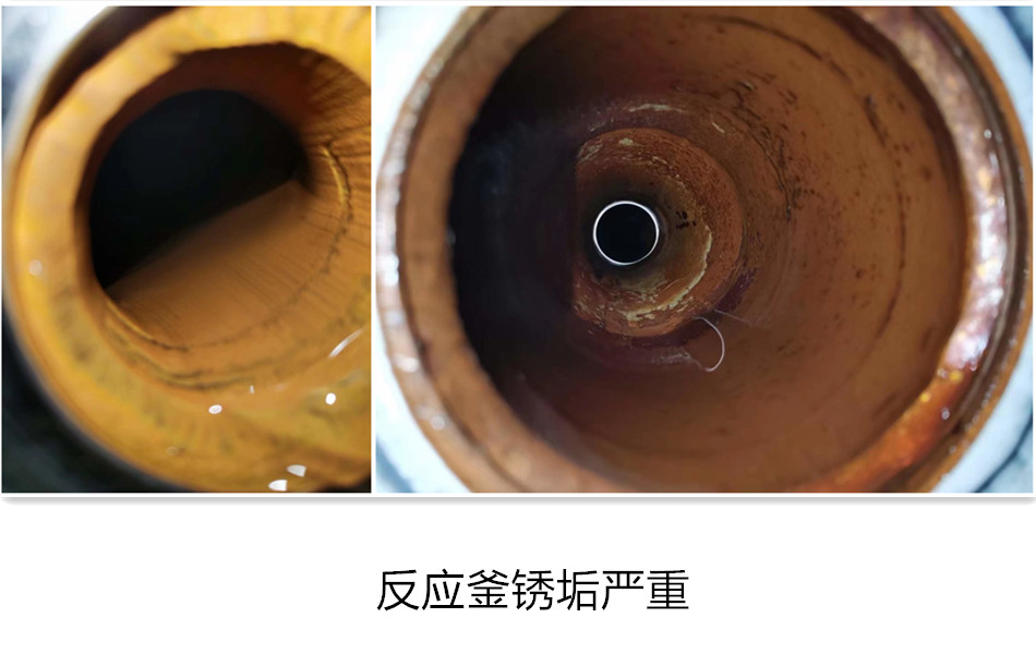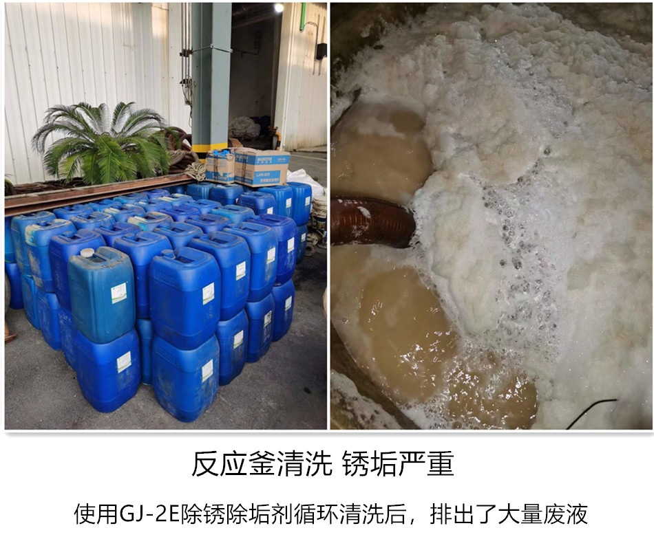 現(xiàn)場(chǎng)反應(yīng)釜夾套銹垢嚴(yán)重,需使用GJ-2E除銹除垢劑才能達(dá)到洗凈率90%以上的效果。