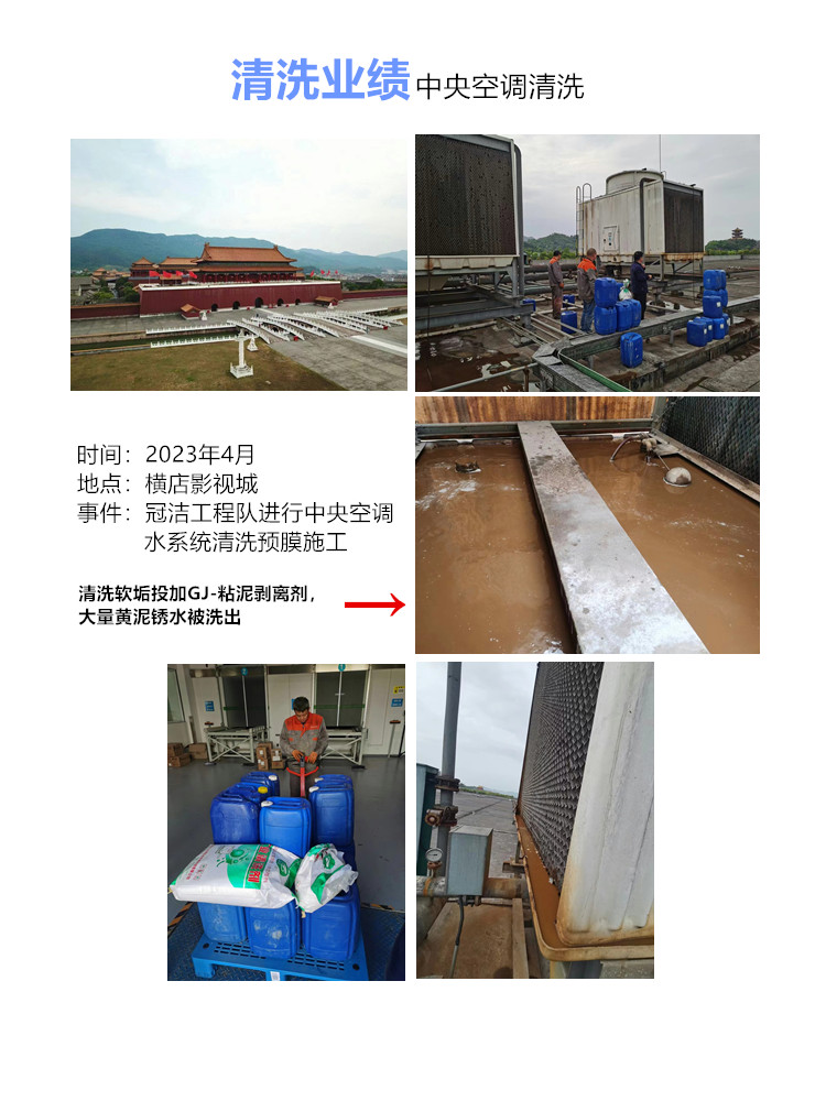 中央空調(diào)水系統(tǒng)清洗,先投加了GJ-高效殺菌粘泥剝離劑,循環(huán)清洗后,大量的粘泥黃水被排出,接著再繼續(xù)清洗中央空調(diào)水垢,加入GJ-空調(diào)中性運(yùn)行清洗預(yù)膜劑,循環(huán)清洗一周時間。