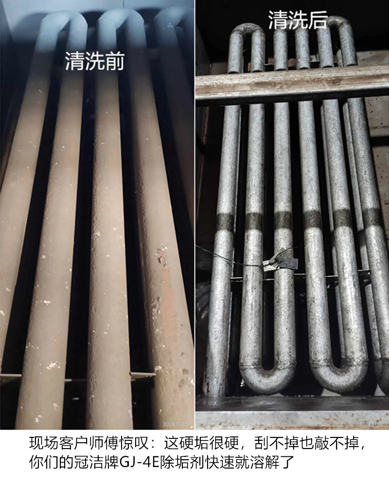 在現(xiàn)場,當(dāng)客戶師傅親眼目睹了清洗效果后,不禁發(fā)出了由衷的贊嘆:“這些硬垢,我們之前嘗試了各種方法,刮不掉,敲也敲不掉,堅(jiān)硬得如同頑固的磐石。沒想到,你們冠潔的GJ-4E除垢劑,就像是專門為這些硬垢定制的克星,短短時間內(nèi)就讓它們迅速溶解,化為了無形。”