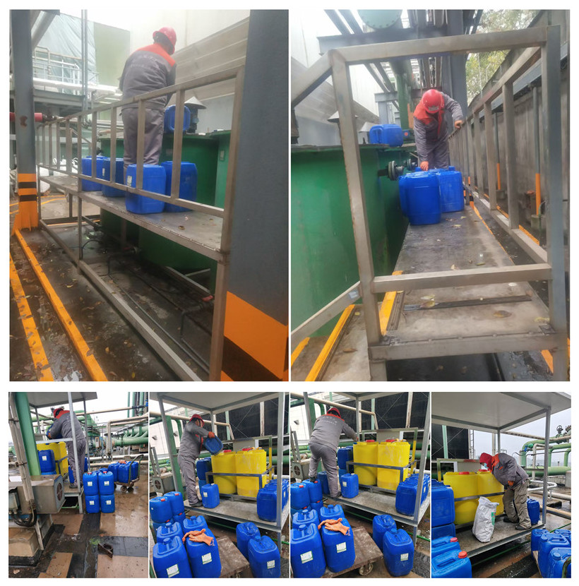 根據(jù)此次工業(yè)循環(huán)水外觀及藻類生長情況,水質(zhì)依舊清澈見底,技術(shù)員便按規(guī)范依次加入殺菌滅藻劑和緩蝕阻垢劑,順利完成此次工業(yè)循環(huán)水處理加藥巡檢工作。